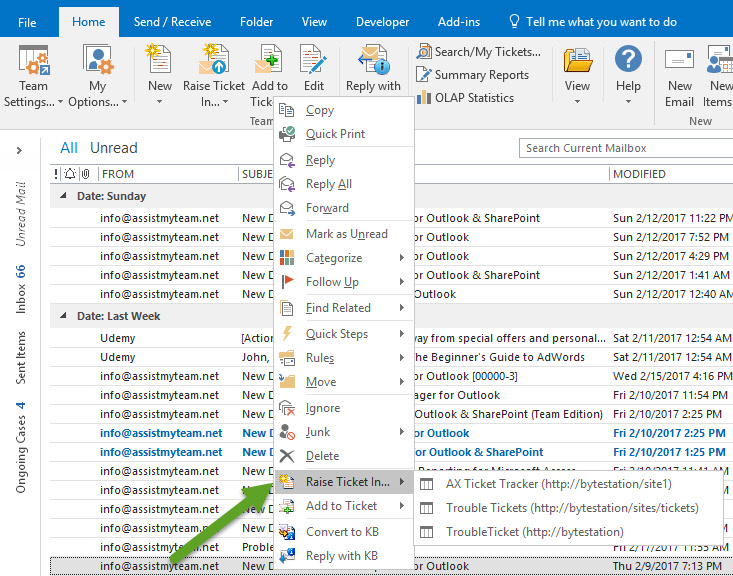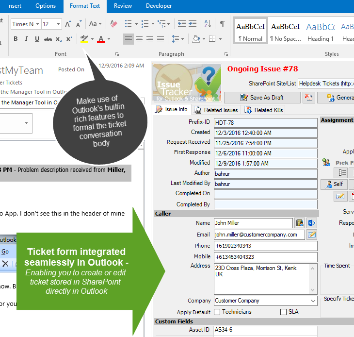 from the ticket form in Outlook. |