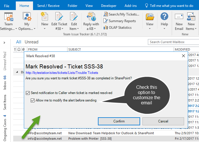 the ticket form in Outlook.