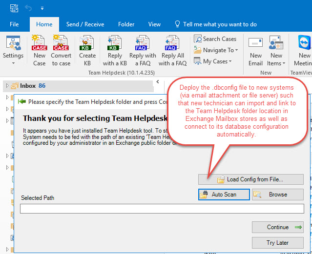 database configuration from a .dbconfig file.![]() ![]() ![]() Another benefit Helpdesk managers can exploit from exporting database configuration to file (*.dbconfig) is to deploy the .dbconfig file to new systems (via email attachment or file server) such that new technician can import and link to the Team Helpdesk folder location in Exchange Mailbox stores as well as connect to its database configuration automatically. ![]() |