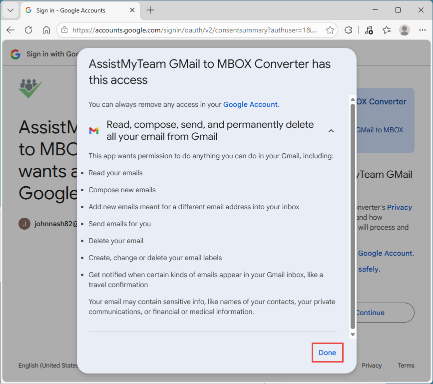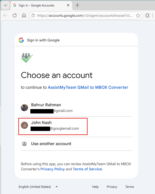 In the OAuth (Modern) authentication, when you try to connect the AssistMyTeam MBOX Converter app to your Google mail account, you will be prompted to grant permissions to the app to access your mailbox in your web browser. To allow the AssistMyTeam app to convert your emails to MBOX, click the particular Gmail account from the prompt.