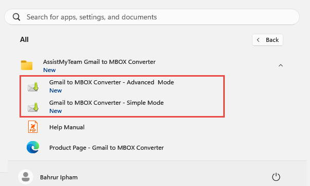 Now go to Start Menu > All Apps. If the installation was successful, you will see new menu entries ‘Gmail to MBOX Converter – Simple Mode’ and ‘Gmail to MBOX Converter – Advanced Mode‘.