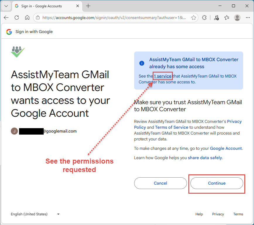 And in the next prompt, you will need to grant access to your chosen Google mail account by clicking the ‘Continue’ button.