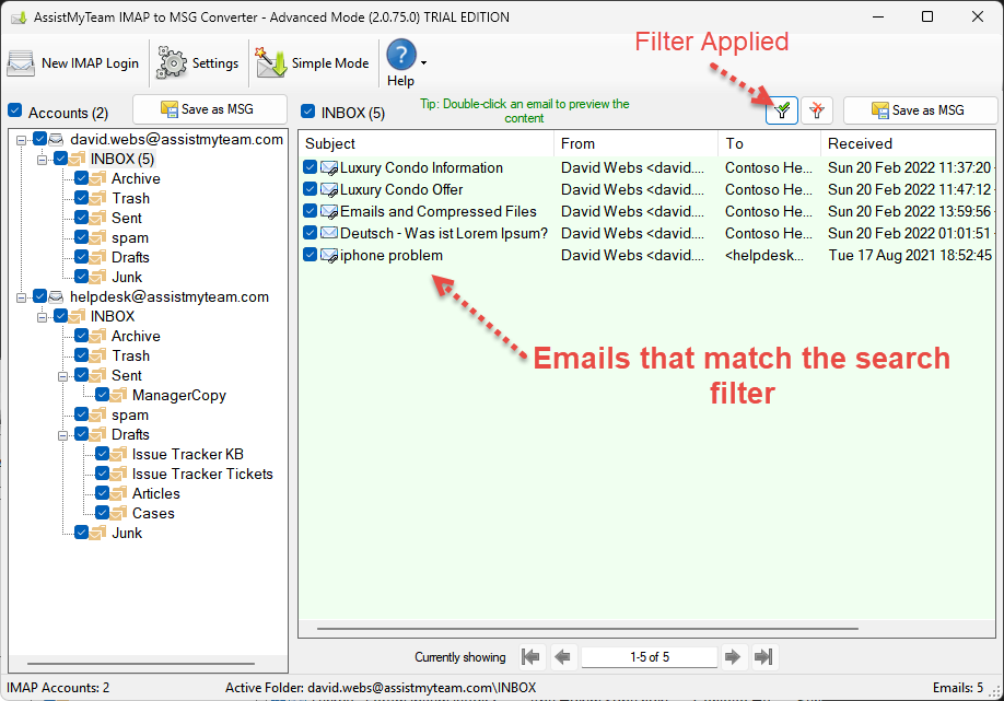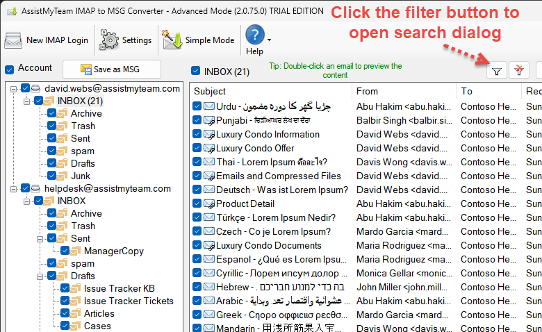 - Use keywords and filters to search and find specific emails of importance before converting to MSG files.