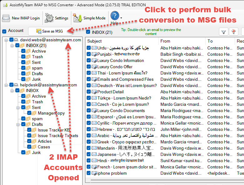 - Bulk conversion of all emails in IMAP to MSG files in a click.