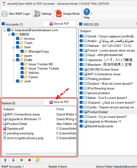 Often you may have the need to club together or consolidate multiple emails or files from different accounts or folders into a single PDF document. Typically, one would convert the individual email or file to own PDF file and then merge these PDF files together into one file. This is a time consuming and cumbersome process. To make this much simpler and easier, you can drag and drop those emails or files of interest, from your email or file folder to the basket control.
