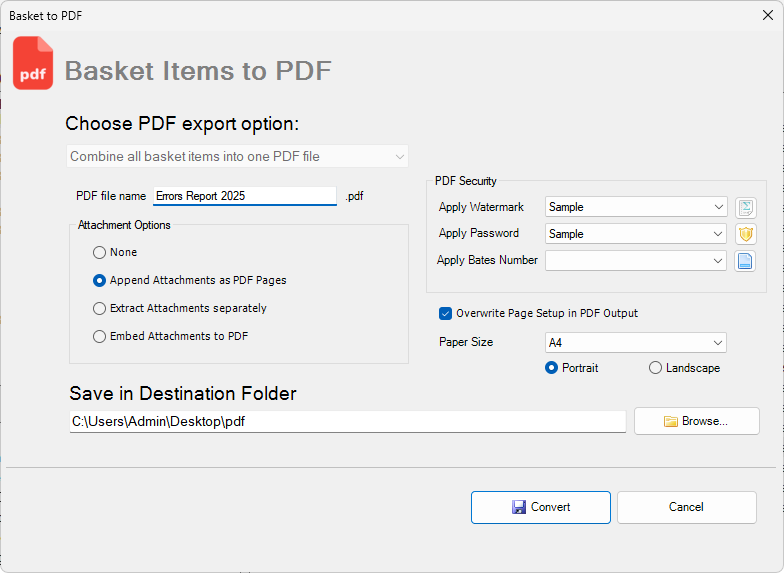 As you build up the emails/files on the basket and once you have them all, you can then combine them all into one PDF file.