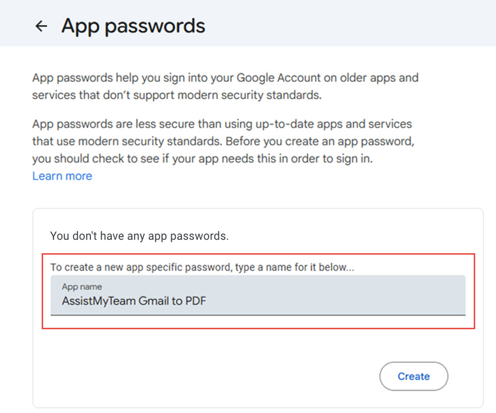 Step 4: Use app password to connect your Gmail account with AssistMyTeam Gmail to PDF Converter app.