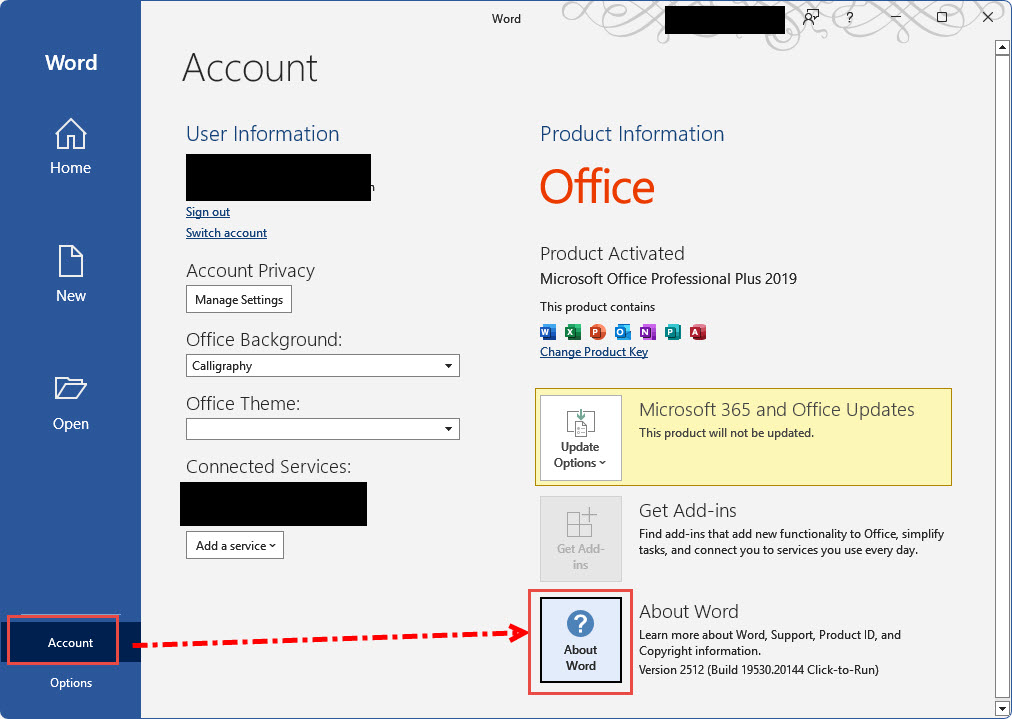 On the right side, you’ll see information about your version of Office. It will show the suite version and included applications, as well as your precise version number and product ID.