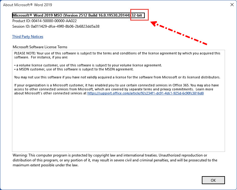 Notice on the right of the version number it shows that this copy of Office is 32-bit.  As mentioned before, this is the most common version of Office 2019.