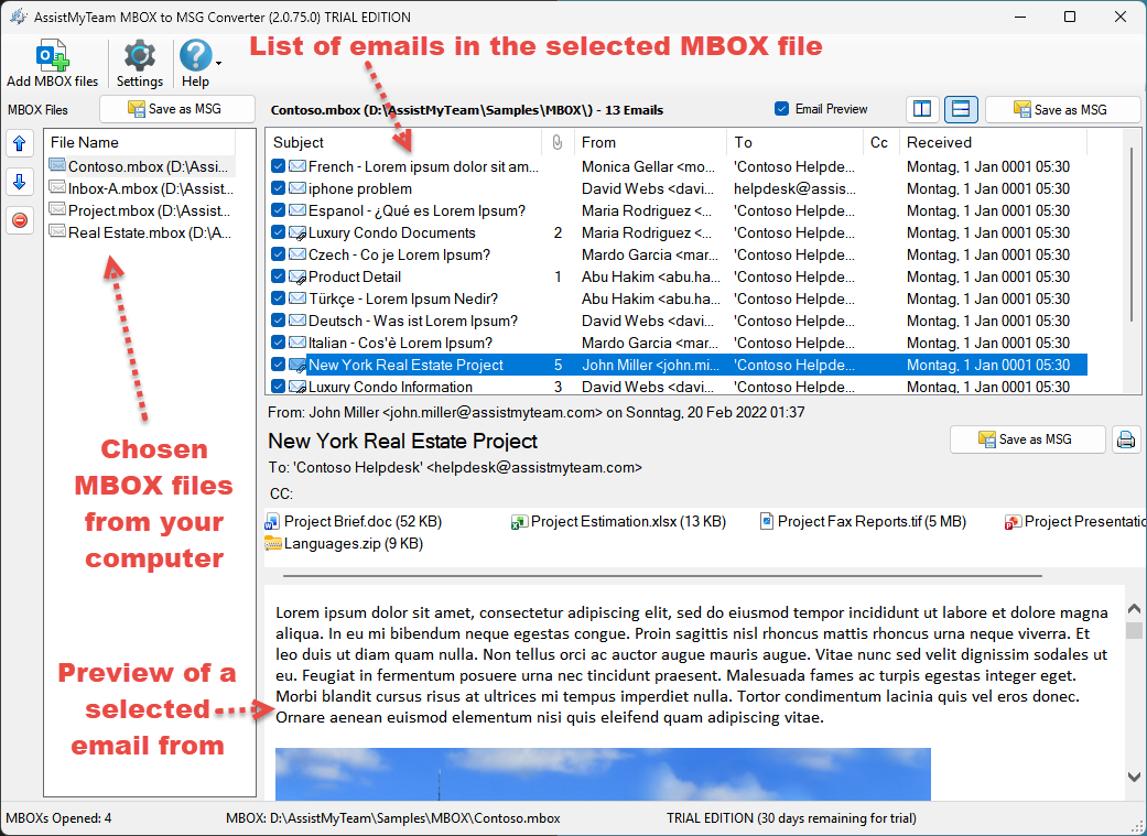 Use the MBOX to MSG Converter as a MBOX Viewer, to view attachments or save to local folder or delete them from the MBOX file.