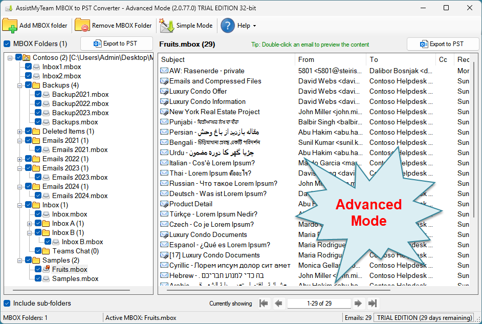 AssistMyTeam MBOX to PST Converter can operate in two modes – Simple (default) and Advanced, which has an interactive user interface with many options to export MBOX files to PST files.