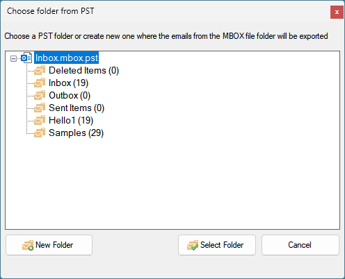 And you will be prompted to choose a PST file from your computer. And then the app will load and display the folders content of the chosen PST file in a prompt dialog box. And you can then choose a particular PST folder where the selected few emails of the MBOX file will be exported to.