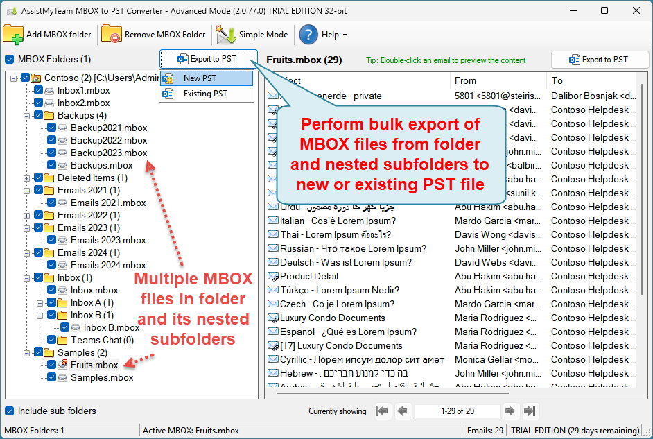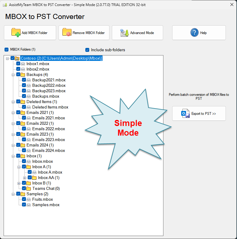 A. Export MBOX files from folders and nested subfolders to PST in bulk