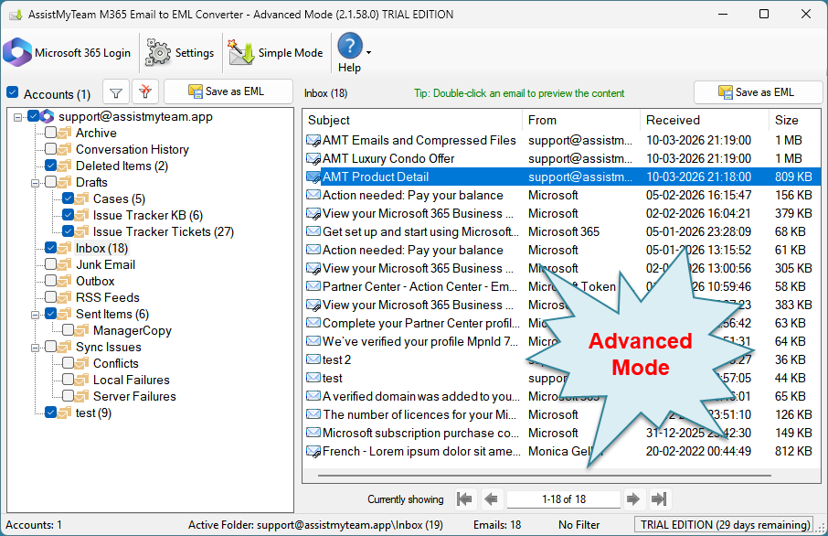 Microsoft 365 to EML Converter can operate in two modes – Simple (default) and Advanced, which has an interactive user interface with many options to export emails to EML files.