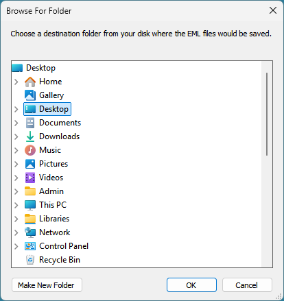 From the ‘Browse for Folder’ dialog box, choose a destination folder where the emails from your Microsoft 365 Inbox and other folders will be exported as EML files.