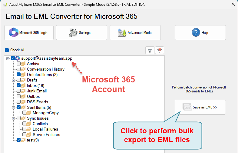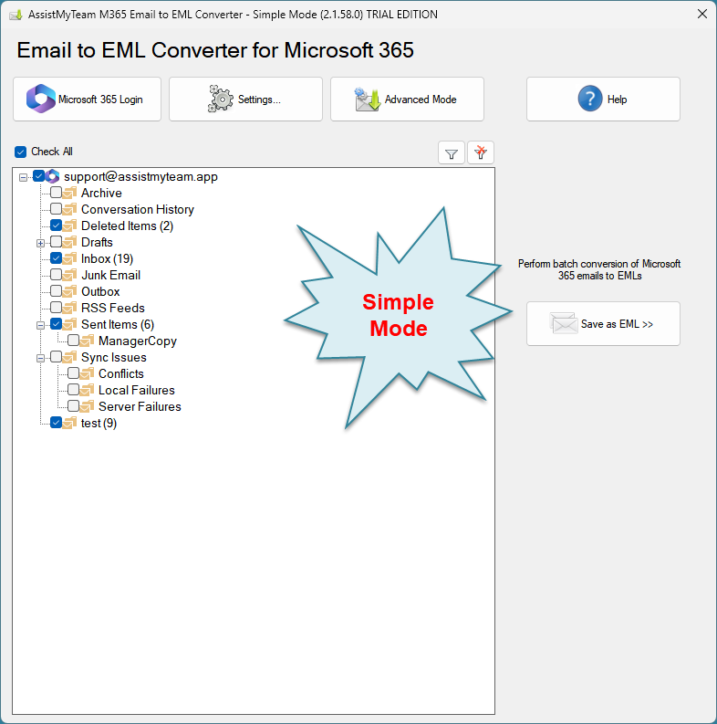 Screenshot: Microsoft 365 Email to EML Converter – Simple Mode