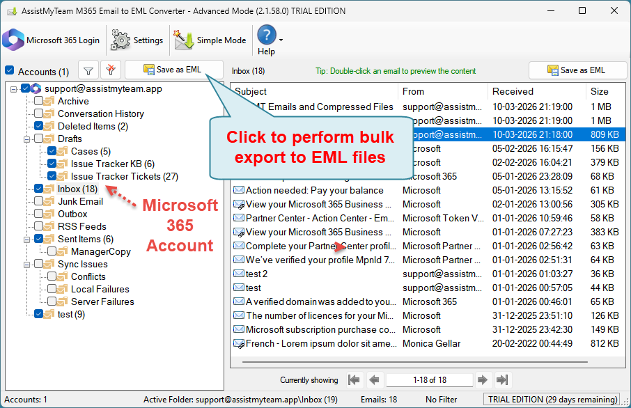 Export and save emails from Microsoft 365 mailboxes to EML files, while preserving the folder structure and hierarchy in your local disk – all in a click.