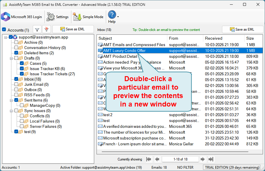With Microsoft 365 Email to EML Converter, preview emails, calendars, contacts, tasks, notes etc. of your mailboxes with all associated metadata attributes, formatting and inline images.
