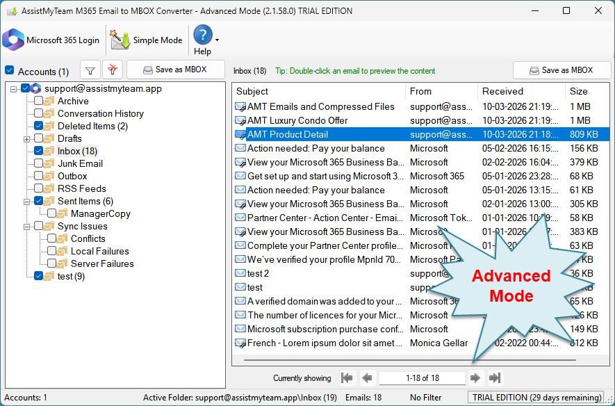 Microsoft 365 to MBOX Converter can operate in two modes – Simple (default) and Advanced, which has an interactive user interface with many options to export emails and folders to MBOX files.