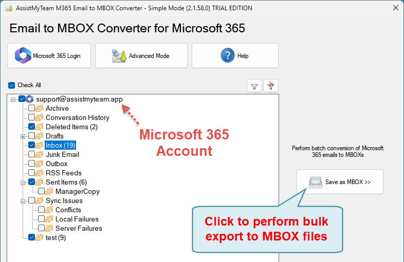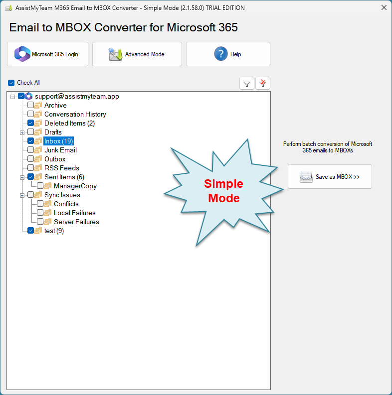 Screenshot: Microsoft 365 Email to MBOX Converter – Simple Mode