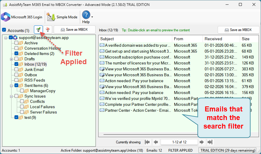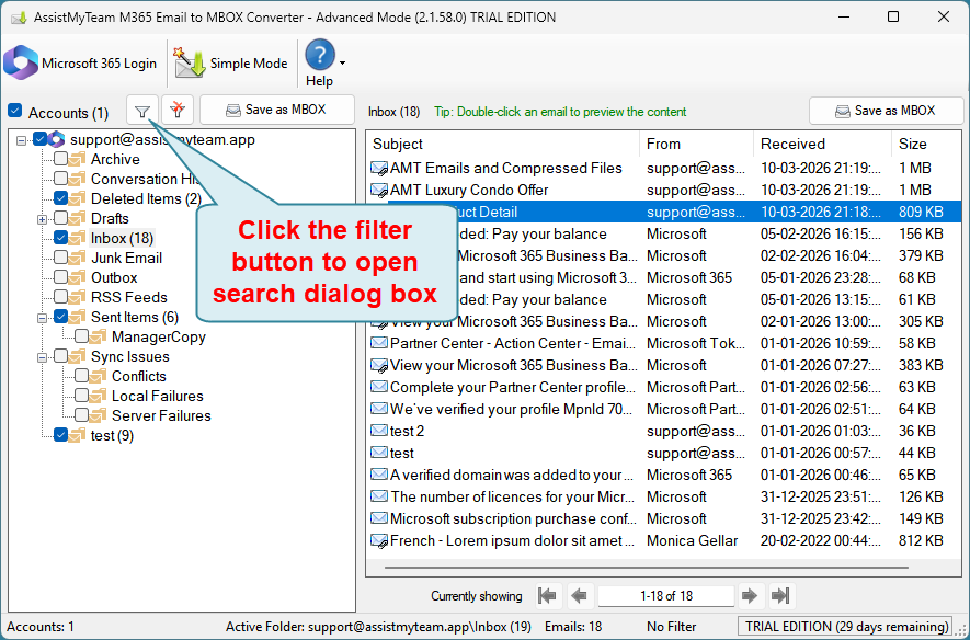You can choose to perform a keyword search and apply filters and only perform the bulk export of those emails in your Microsoft 365 account that fulfill the search parameters to MBOX. To do that, click the ‘Filter‘ button available on top of the tree-view control box.