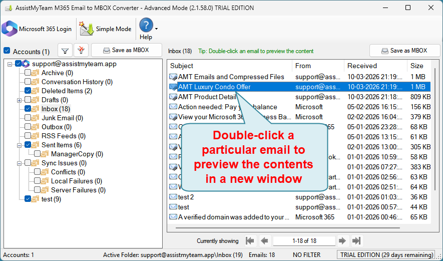 With Microsoft 365 Email to MBOX Converter, preview emails, calendars, contacts, tasks, notes etc. of your mailboxes with all associated metadata attributes, formatting and inline images.