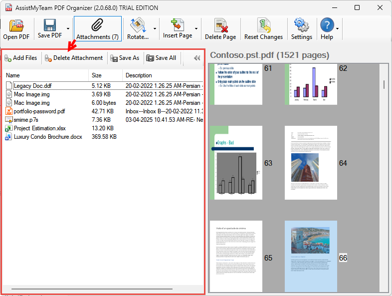 One of the widely used features of the PDF format is its capability to embed video, images, and various file attachments such as office documents (DOCX, XLSX, PPTX etc.). With AssistMyTeam PDF Organizer, you have quick access to these embedded files present in your PDFs. Just click the ‘Attachments’ button from the toolbar. This will show a vertical panel on the left showing the attachments present in the opened PDF file.