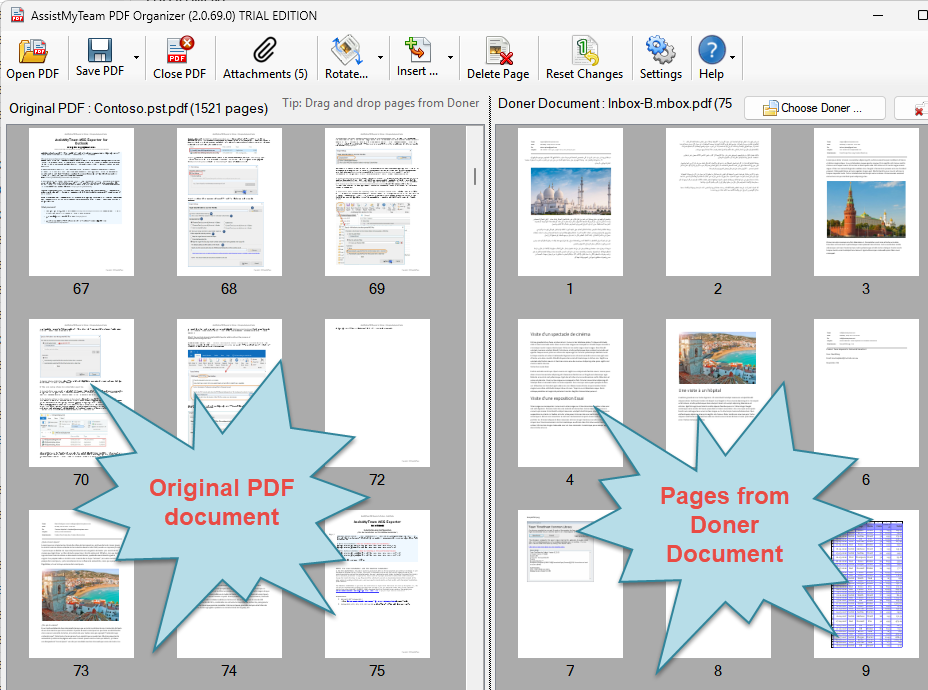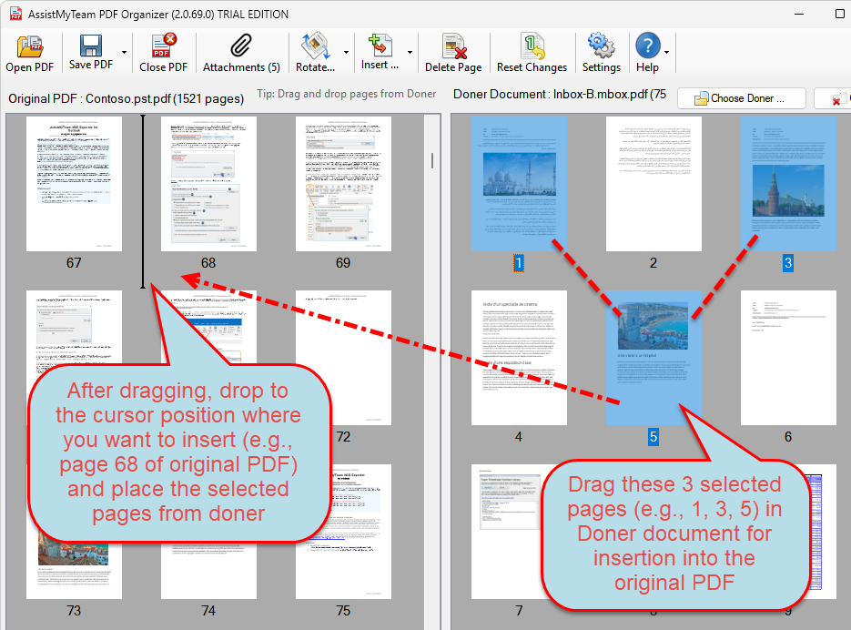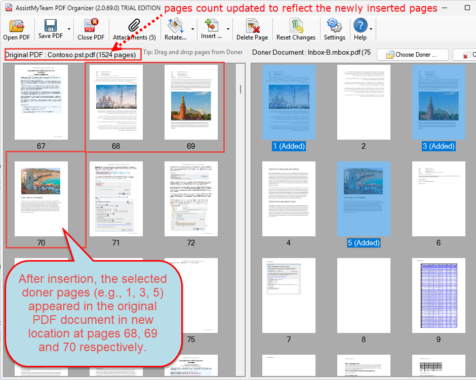 Now, all you have to do is to choose the page(s) from the doner panel and add them to the specific location or page in the original PDF document. This is easily done by dragging the pages from the doner section (on the right) and dropping them to your desired location/page of the original PDF document (on the left).