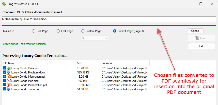 - Insert multiple types (120+) of documents in a click as PDF pages into your existing PDF.