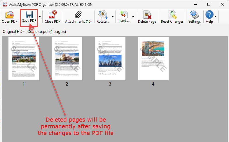 NOTE: The page deletion from the original PDF document is only in the memory until you save the changes made by clicking the ‘Save PDF’ button (in which case, the changes are written to the PDF file permanently).