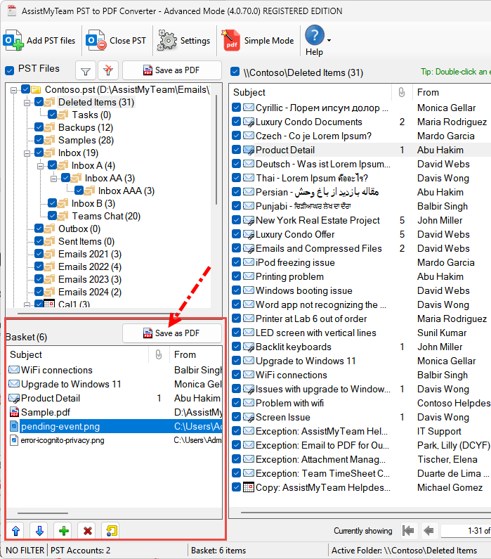 AssistMyTeam PST to PDF Converter can operate in two modes – Simple (default) and Advanced, which has an interactive user interface with many options to export emails to PDF documents.