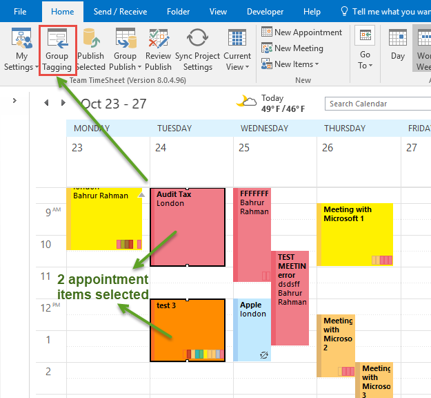 To tag the same project or activity to multiple selected appointment or task items in Outlook, select multiple items and from the timesheet toolbar ribbon, click ‘Group Tagging’.