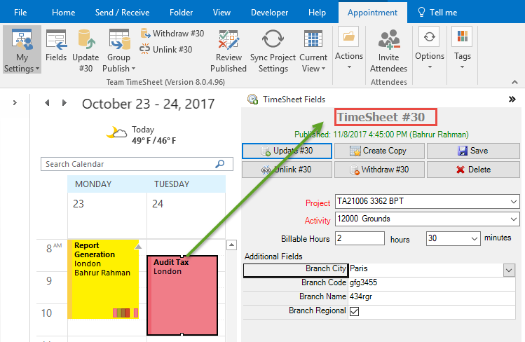 If the publishing was successful, the timesheet ID that was generated in the database will be assigned to the particular Outlook item for reference.