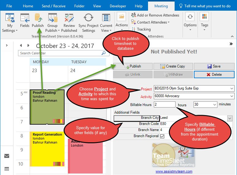 After finishing tagging project related data on the Outlook appointment or task item, your timesheet is ready for publishing to database. Click the ‘Publish’ button either in the toolbar UI, or in the timesheet form to report and publish the selected appointment to the central database or SharePoint.