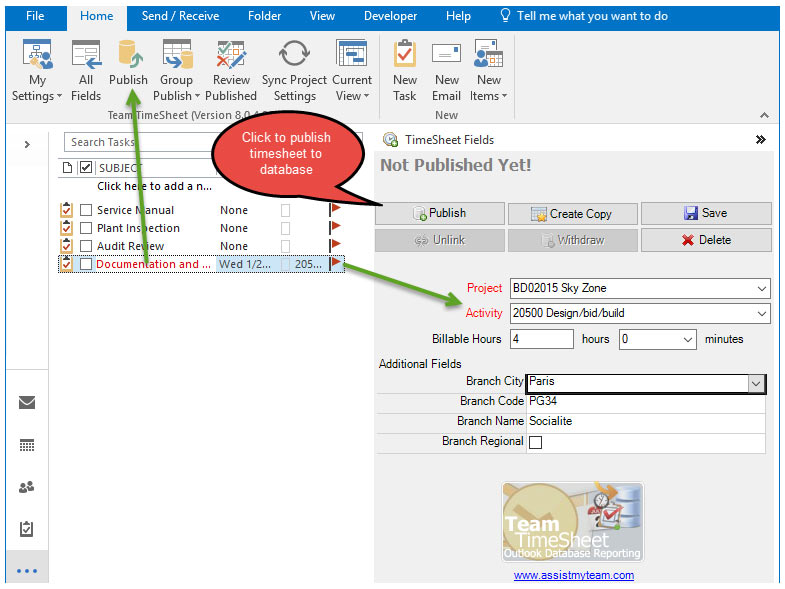 AssistMyTeam TimeSheet for Outlook makes working on project activities very easy by seamlessly integrating the access to projects, deployment, tracking and reporting of timesheets all inside Microsoft Outlook.